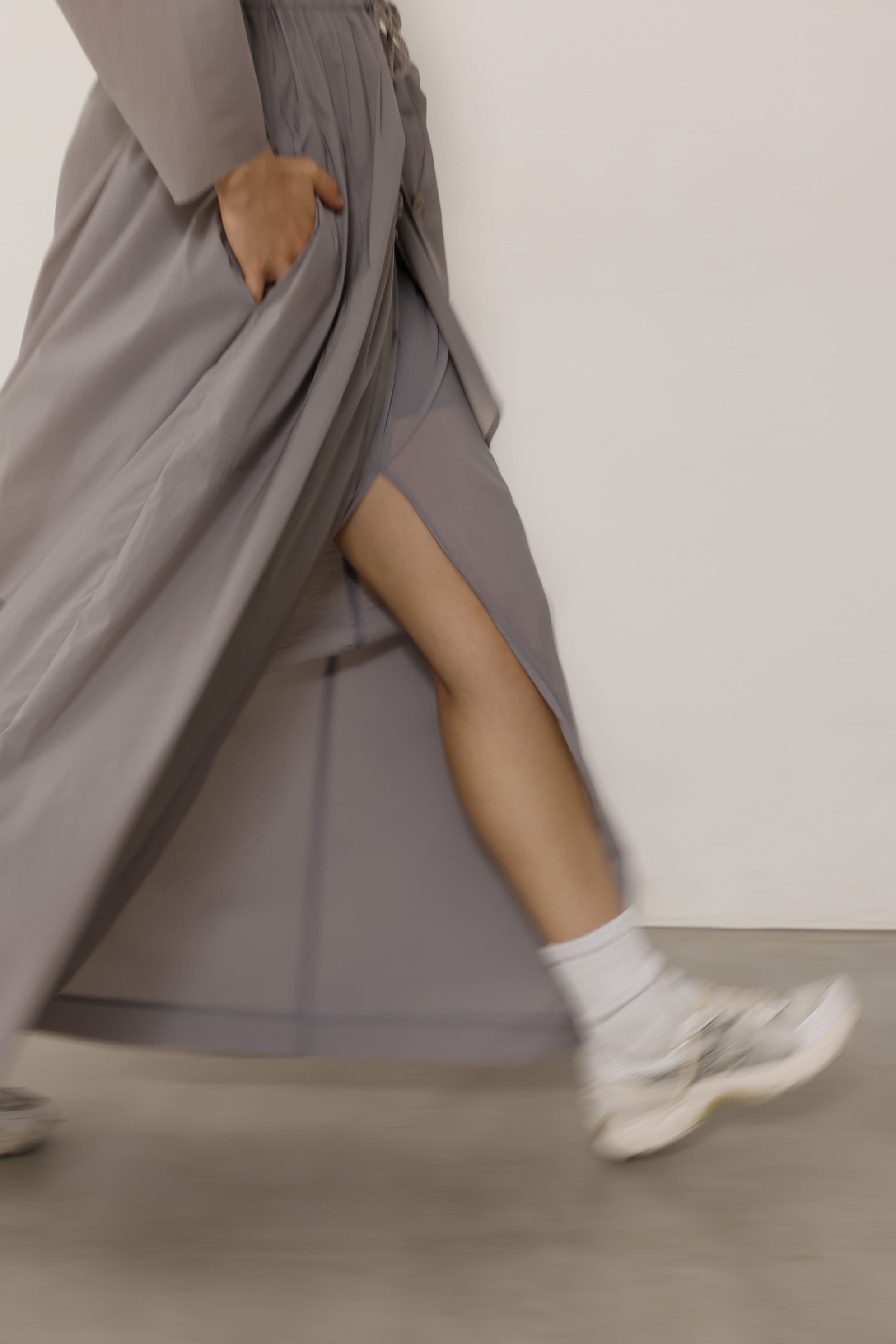 軽やかな素材感が魅力のナイロンロングコート&ドレス。