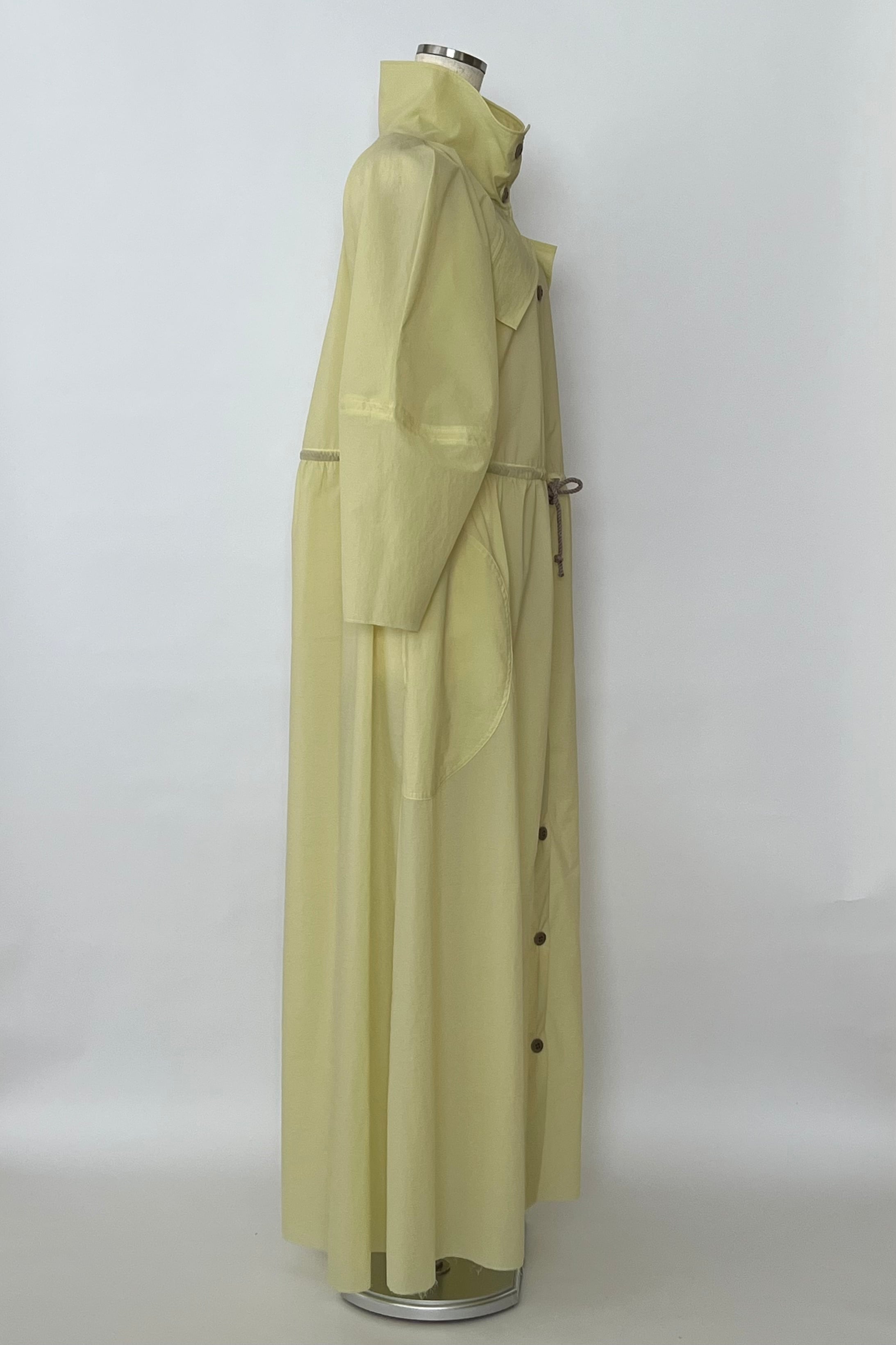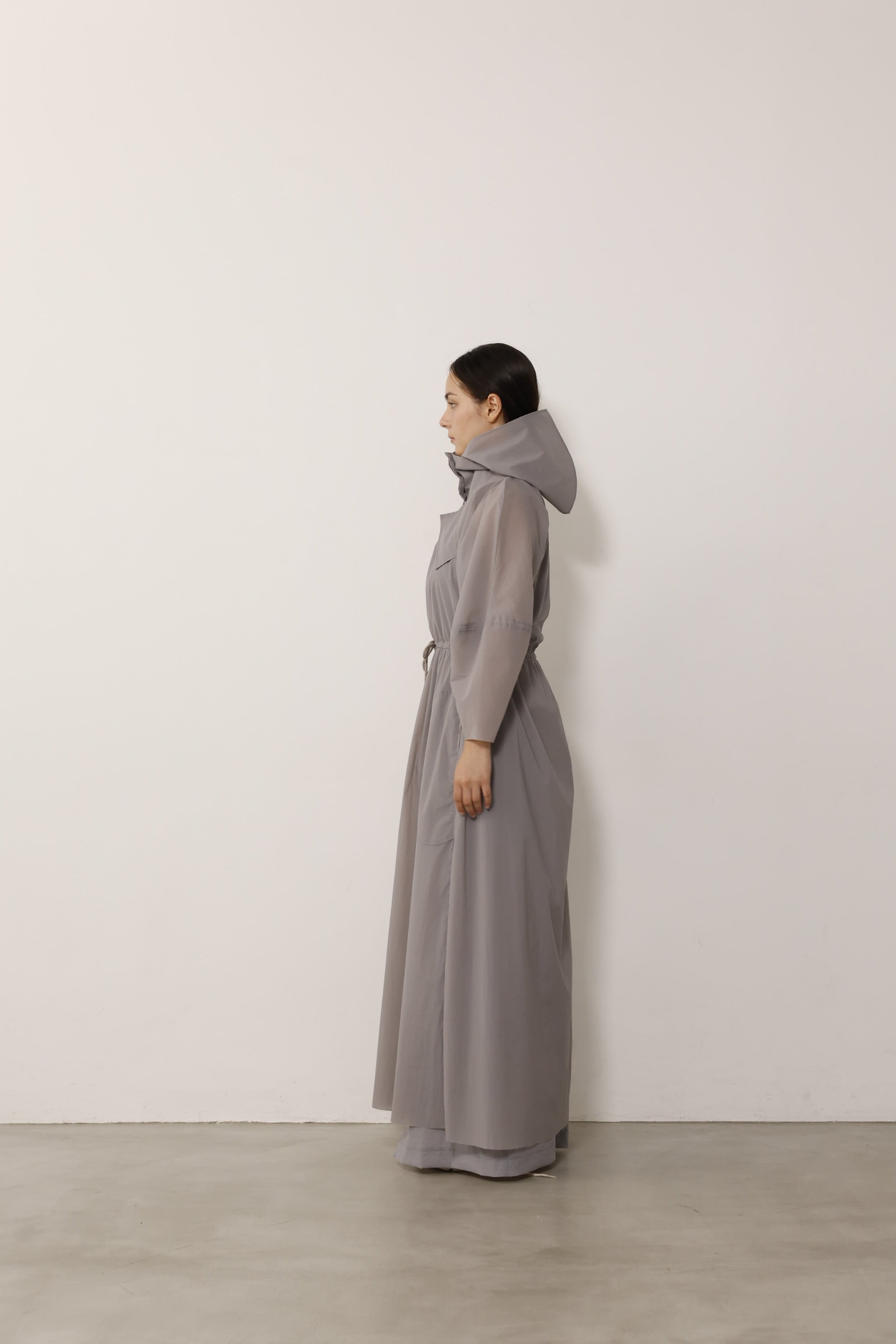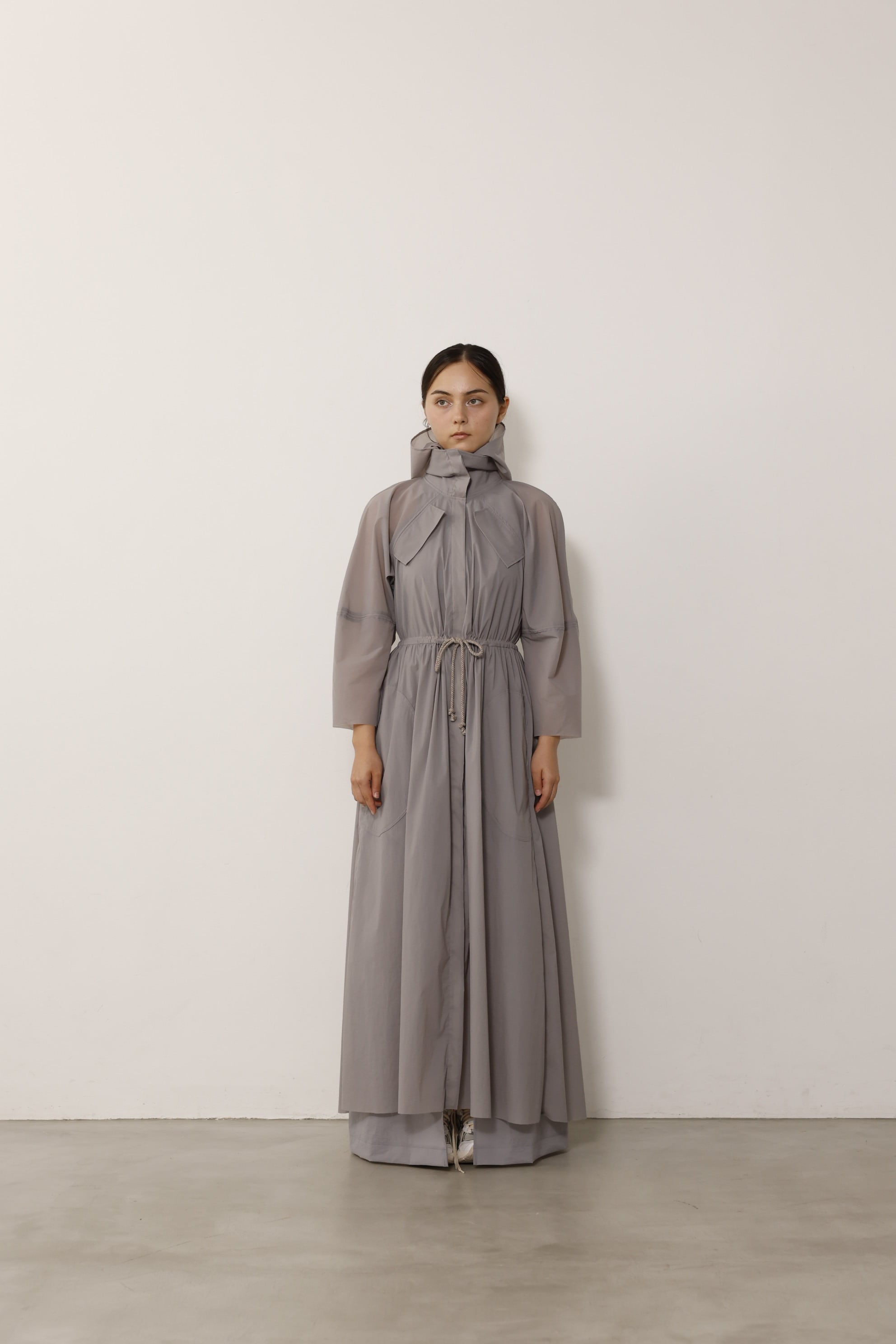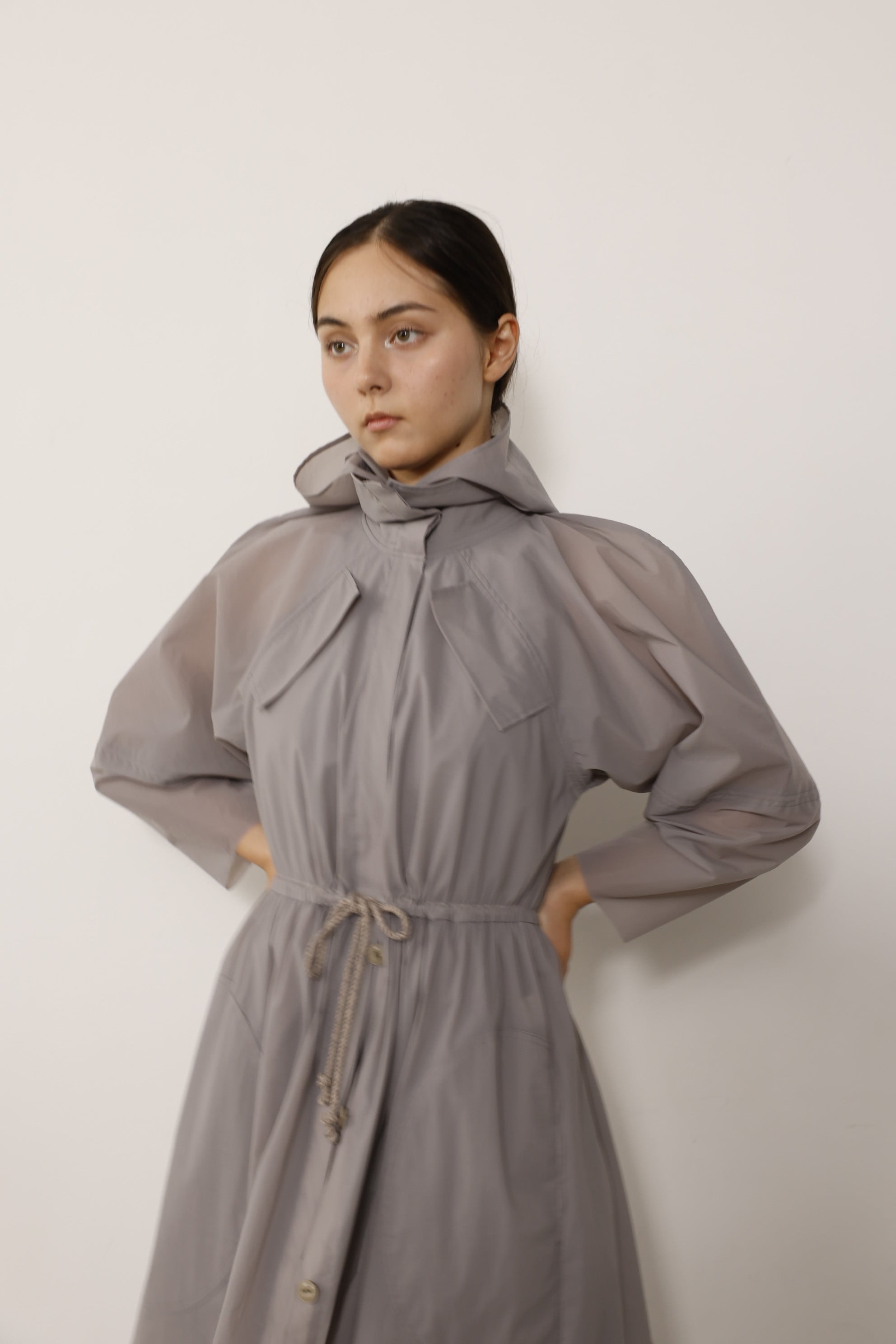 シアーでドレスのような装いながら機能的なデザイン。肌寒い時期のライトコートには多用できます。