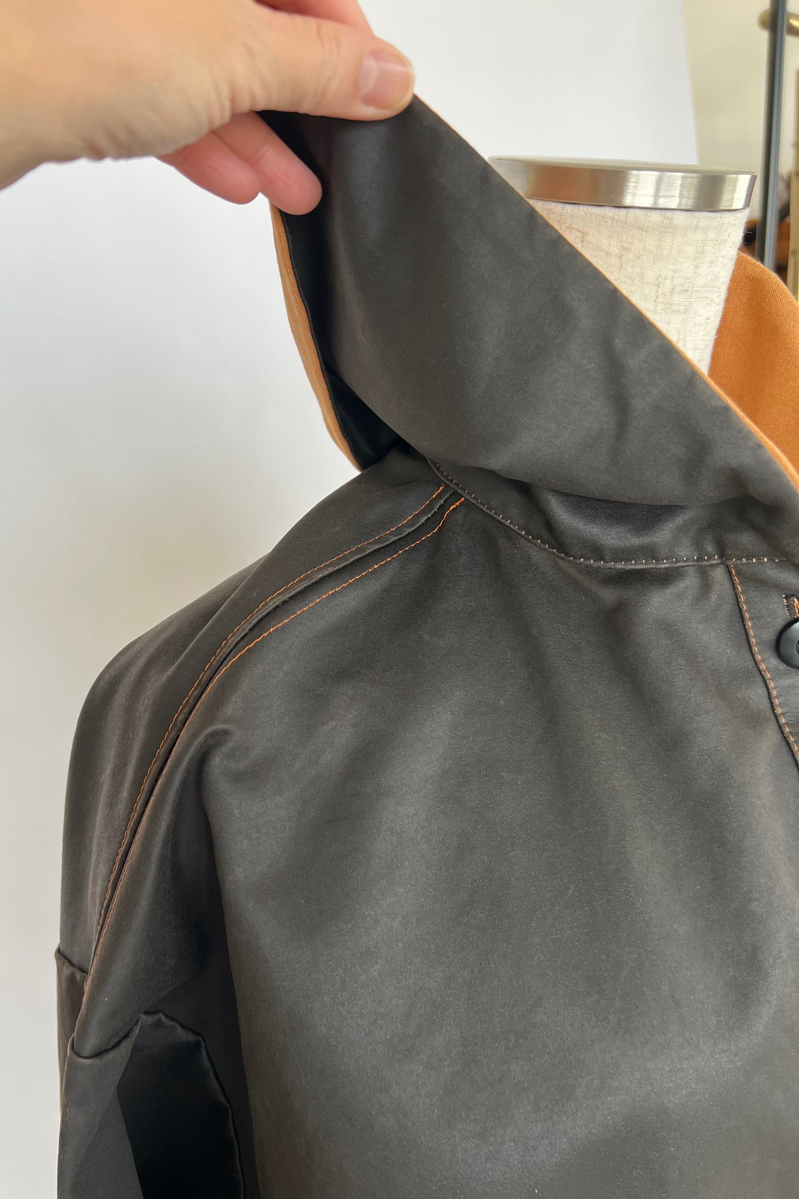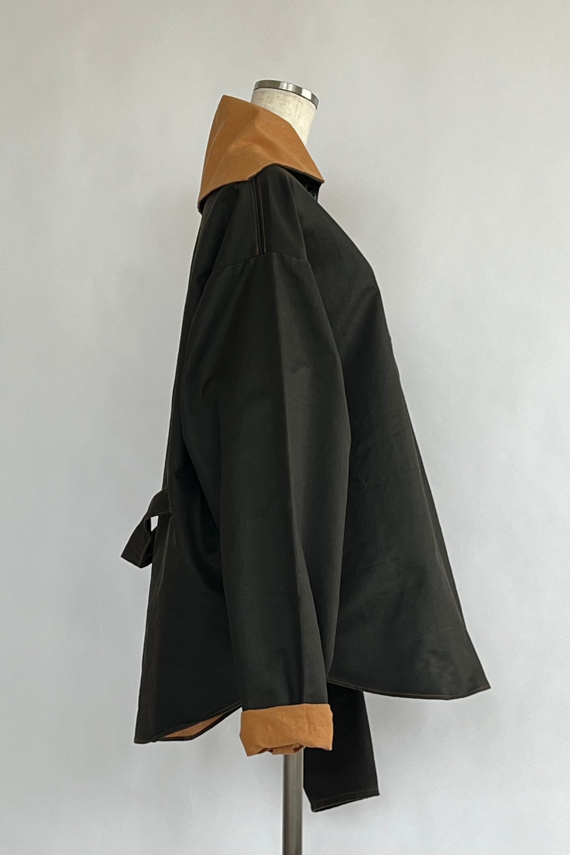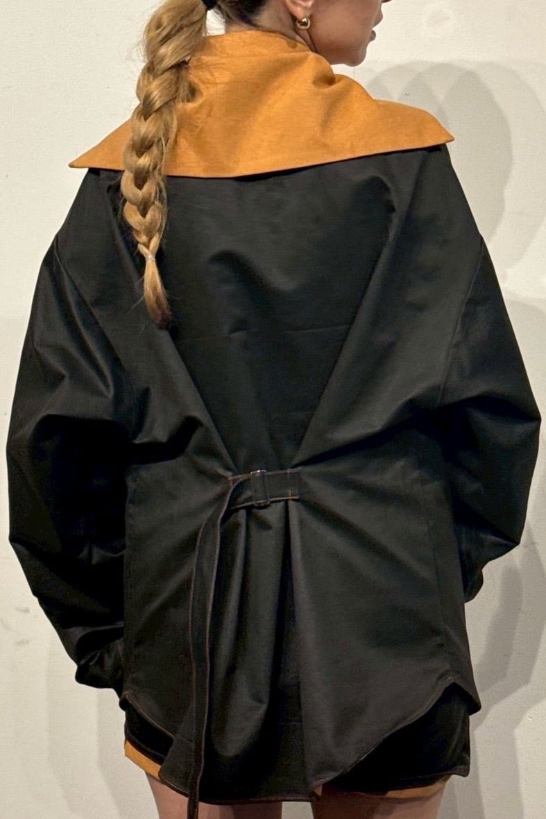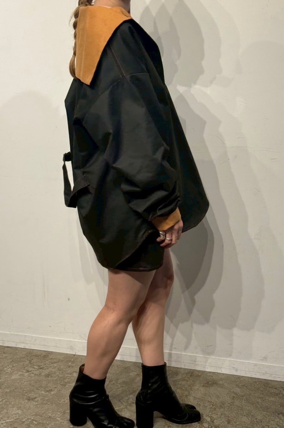 2025秋冬で人気だったハビットハイネックプルオーバーを黒のワックス生地に変更して、後ろにベルトを着けバックシルエットも綺麗に構築。