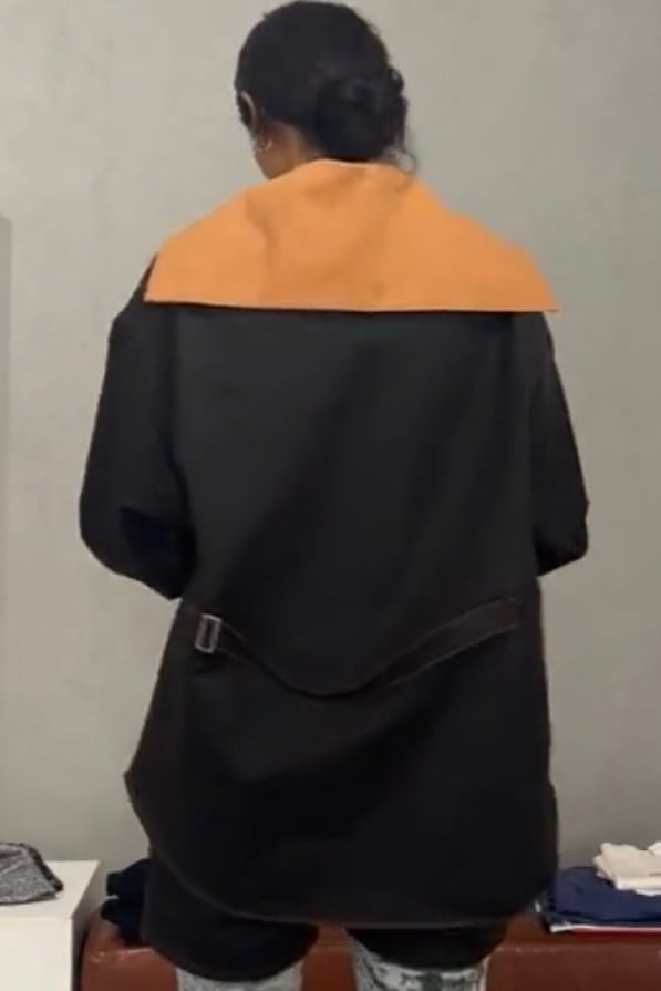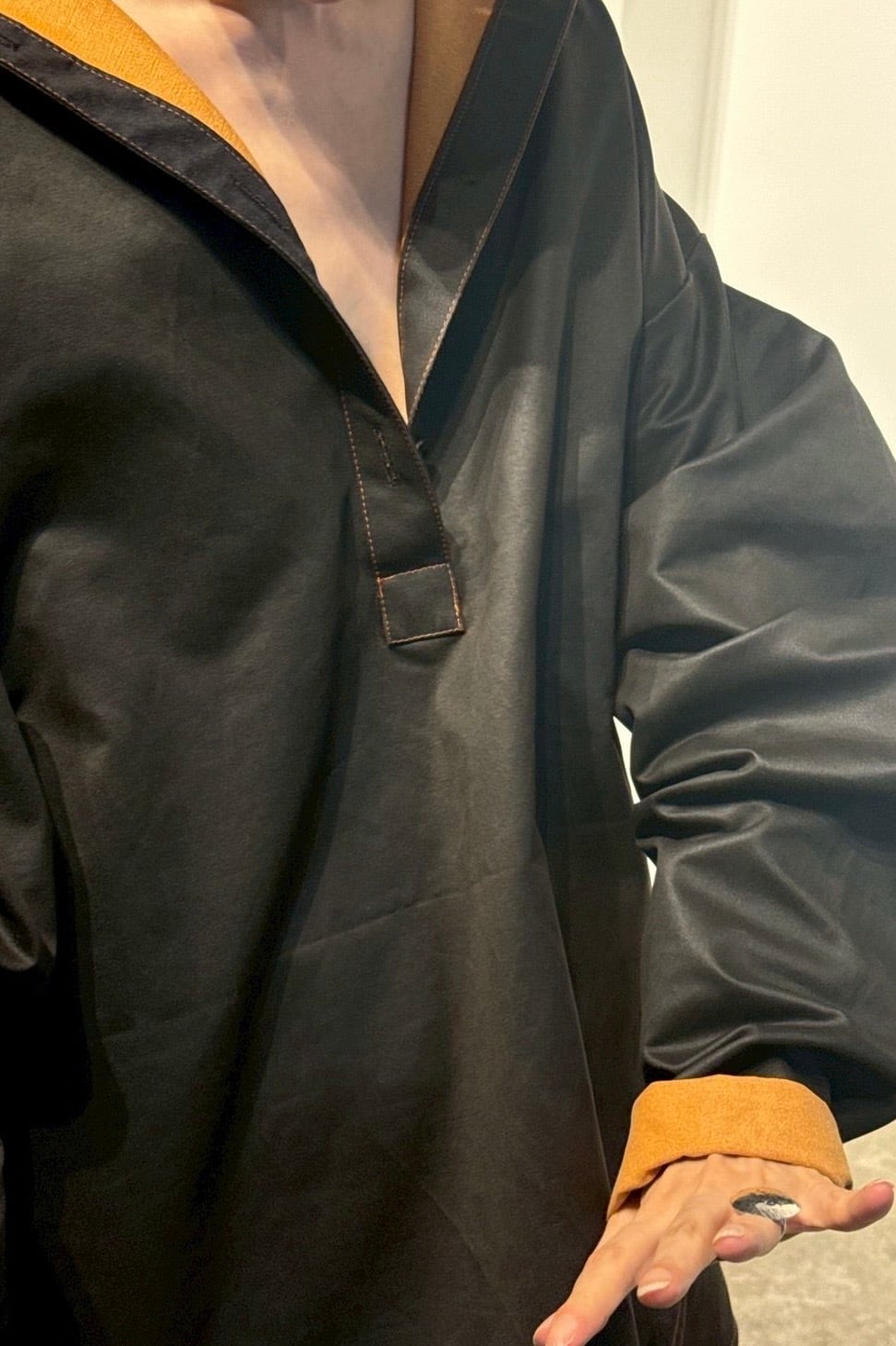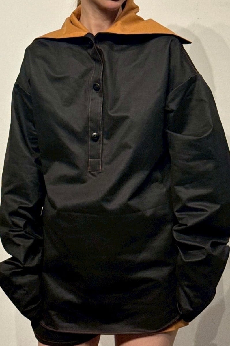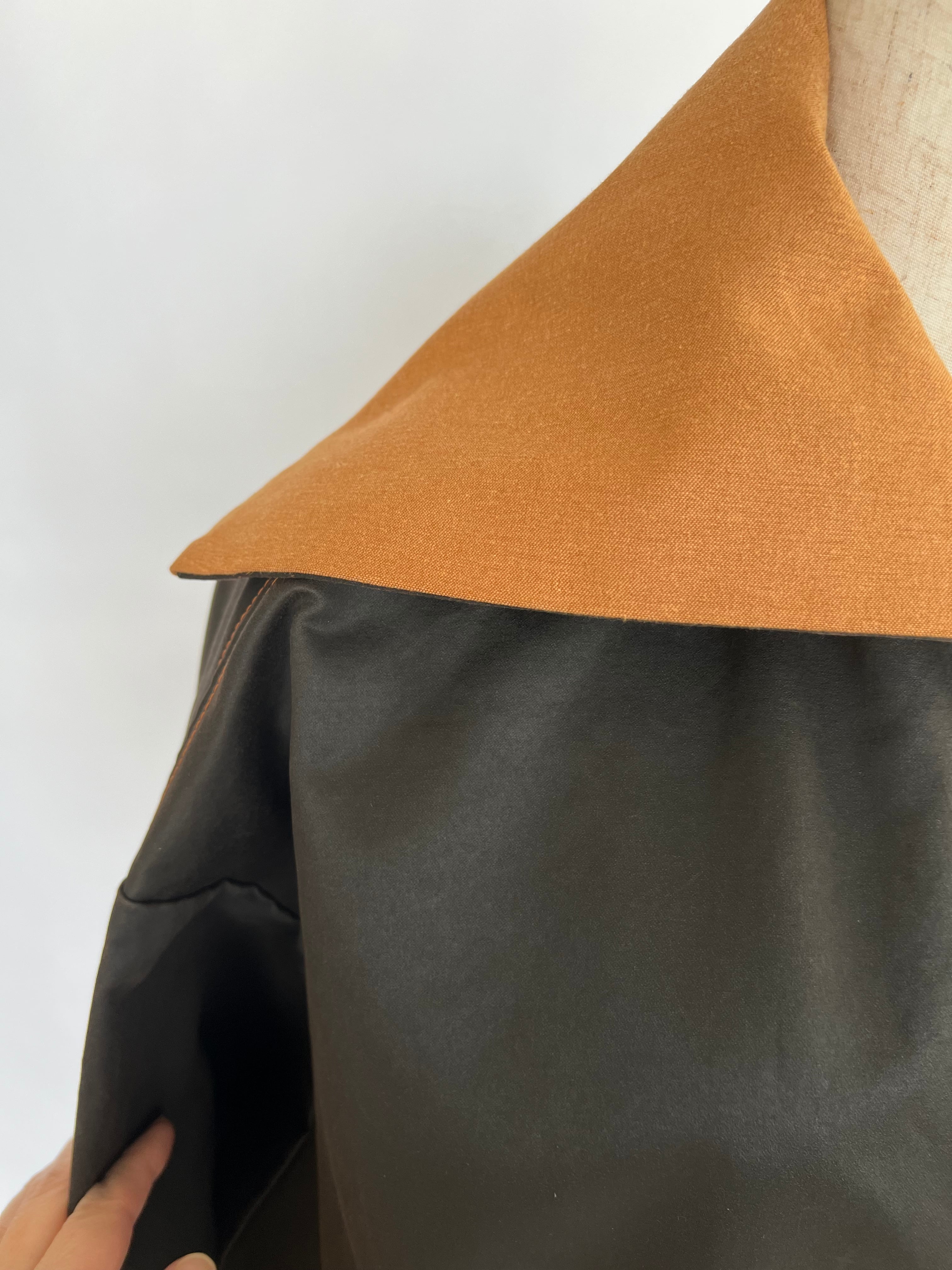 2025秋冬で人気だったハビットハイネックプルオーバーを黒のワックス生地に変更して、後ろにベルトを着けバックシルエットも綺麗に構築。
